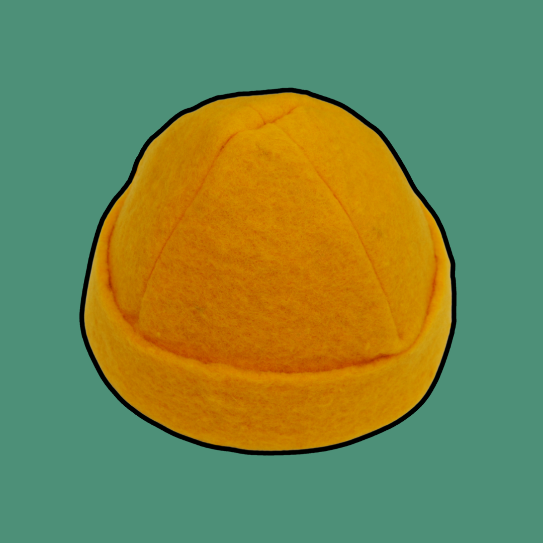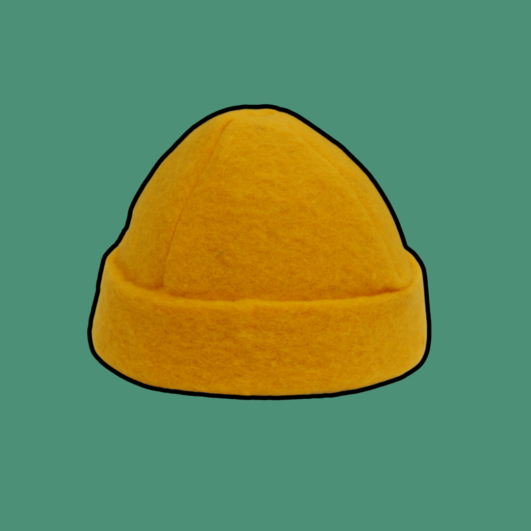 Bærekraftig lue av filt fra 100% norsk løsull i sprek sennepsgul - for bading i badstue og isbad.